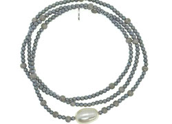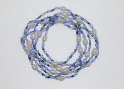 Weiße Süßwasserperlen, hallblaue Glasperlen, Hämat